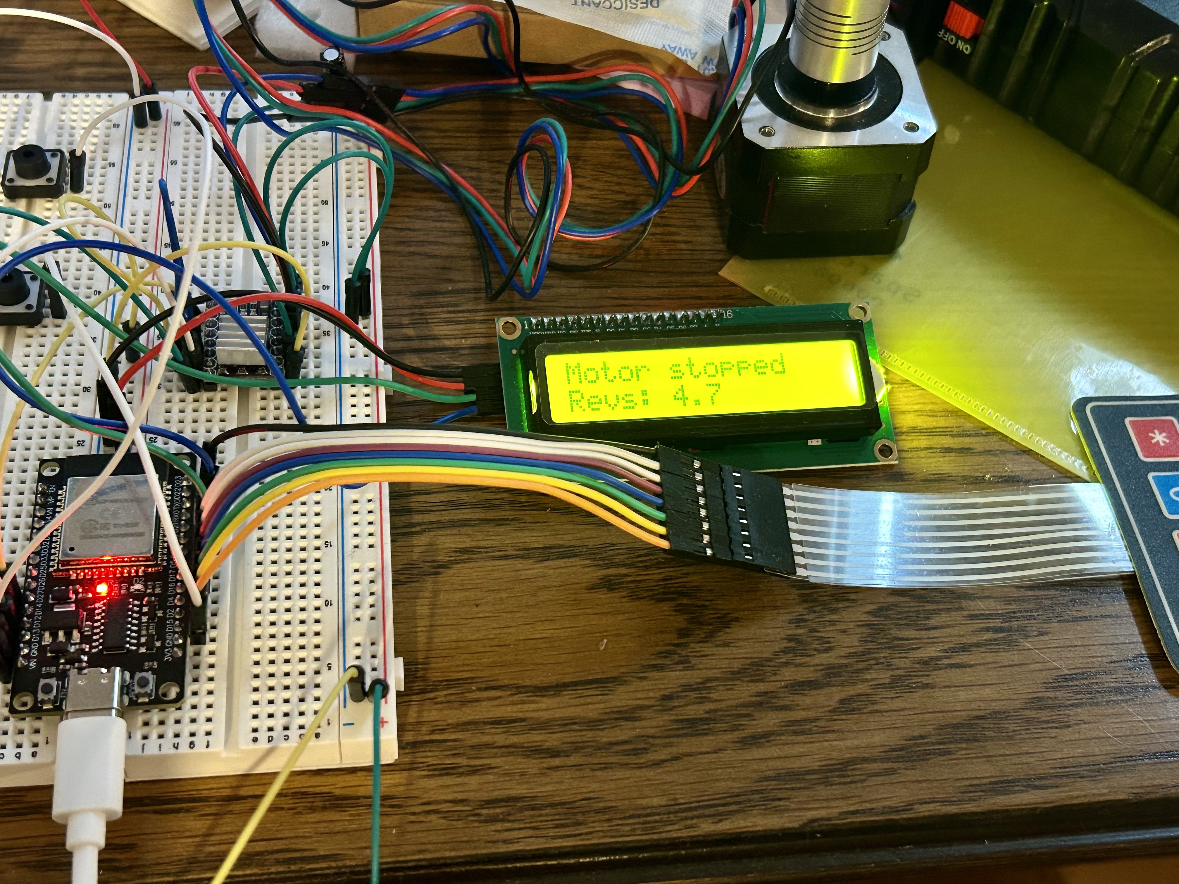 - Initialization: The ESP32 initializes the LCD to display motor status and revolution data, sets up the DR8825 driver with specific step and direction pins, and configures the keypad for input. This ensures all components are ready for operation upon startup.