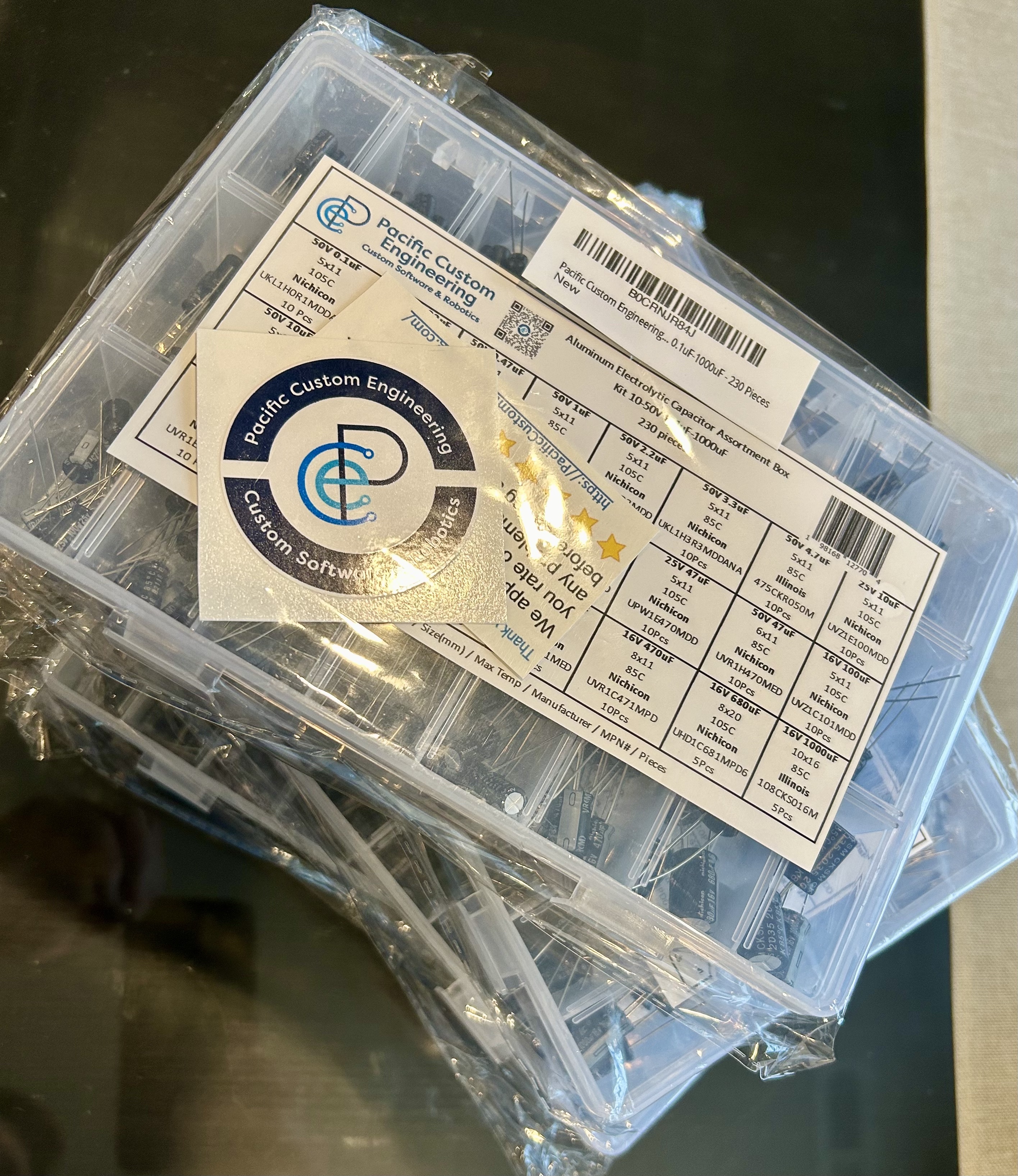 Aluminum Electrolytic Capacitor Assortment Box Kit 10-50V 0.1uF-1000uF – 230 pieces – Panasonic, Nichicon, Illinois capacitors.