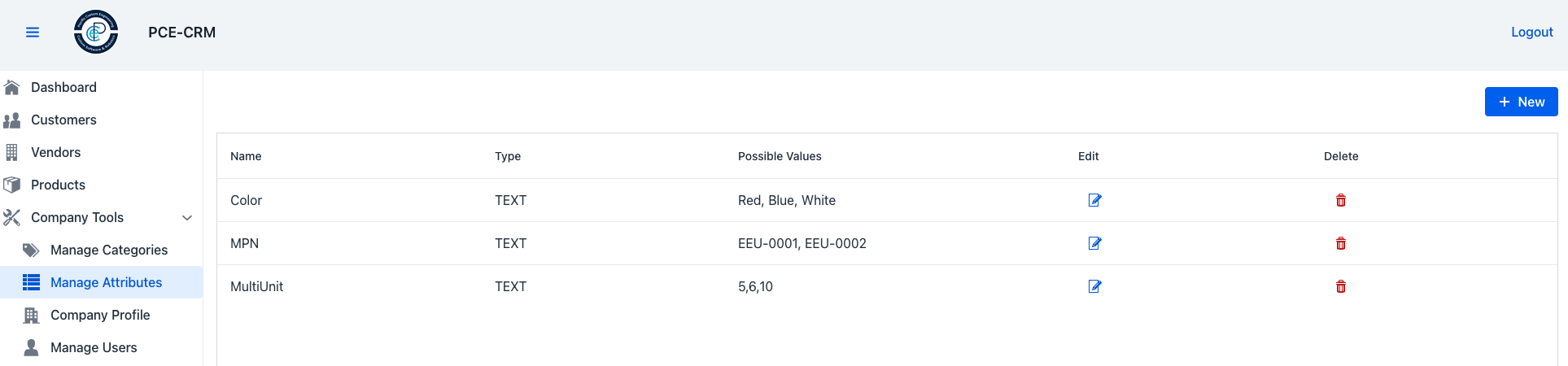 • Categories and Attributes — Organize products flexibly with custom categories and attributes (text-based, with possible values).