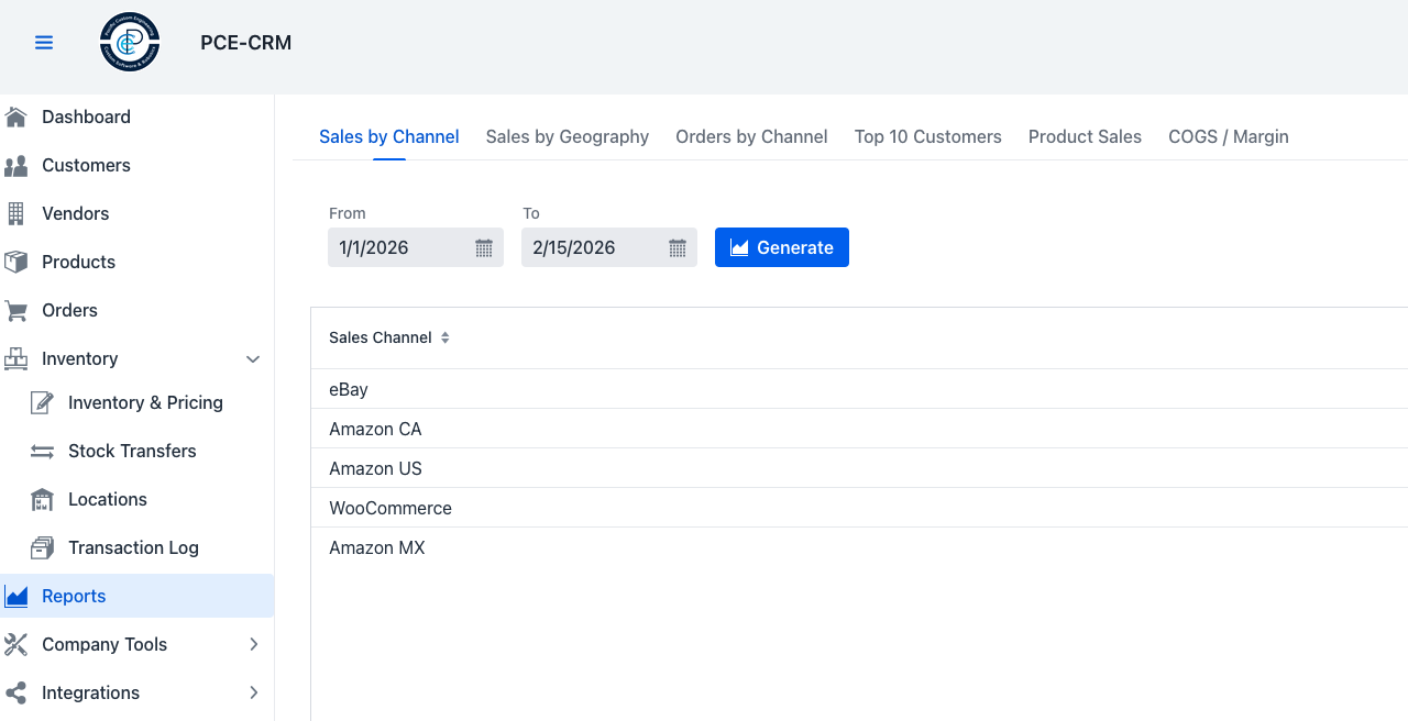 • Explore Reports – Gain actionable insights with customizable reports including Sales by Channel, Sales by Geography, Orders by Channel, Top 10 Customers, Product Sales, and COGS/Margin analysis; select date ranges and generate detailed breakdowns to track performance, identify trends, optimize pricing, and make data-driven decisions across all integrated sales channels.