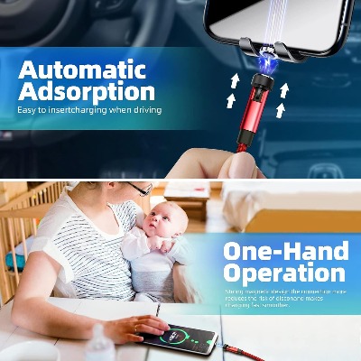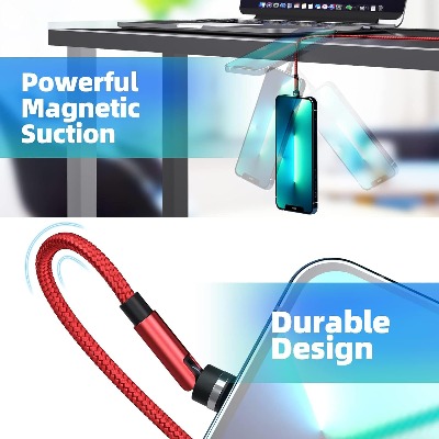 The design includes a 360° rotating magnetic tip and a 180° bendable head, allowing for flexible positioning during use. The cable is constructed with a nylon-braided exterior and includes strong magnets for a stable connection, along with dust-proof tips to reduce wear on device ports.